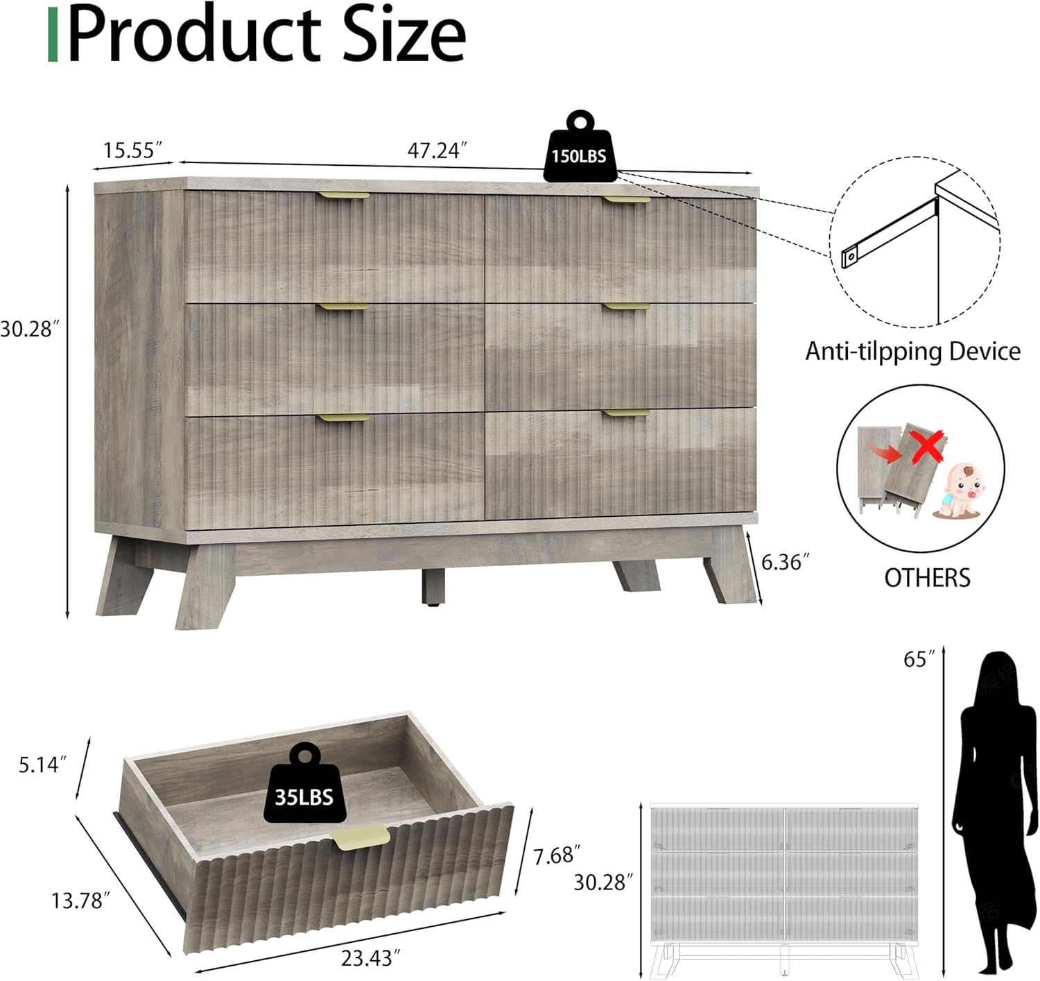 Fluted Dresser for Bedroom with 6 Drawers, 48" Wide Modern Chest of Drawers with Metal Handle, Wooden Dresser TV Stand, Wood Closet Clothes Storage Organizer for Living Room, Hallway, Grey