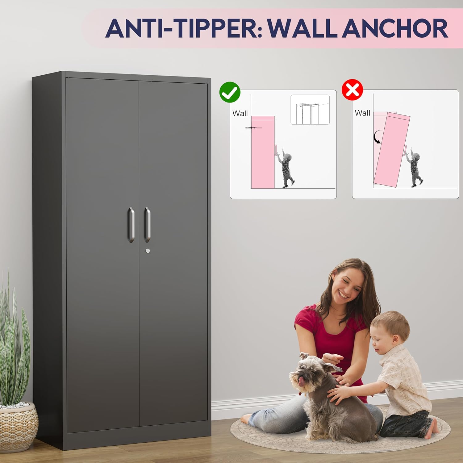 71" Garage Storage Cabinets with Lock, Cabinets with Doors and Shelves, Kitchen Pantry Cabinet, Metal Cabinet for Office, Garage, Shop, School, Assemble Required, Black