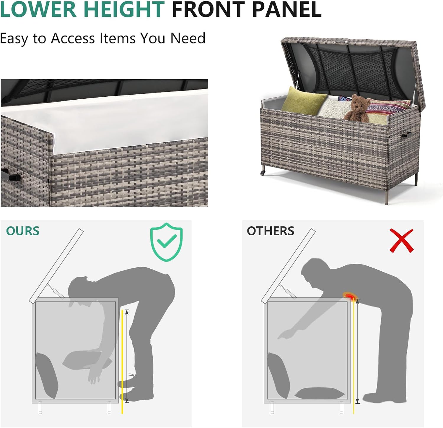 • Handcrafted Wicker Weaving: Our waterproof 240 gallon deck box is made from a selection of uv- and fade-resistant polyethylene rattan, these bins can withstand all weather conditions. To prolong the life of your rattan storage box, we recommend that you keep your storage box indoors when it is raining heavily