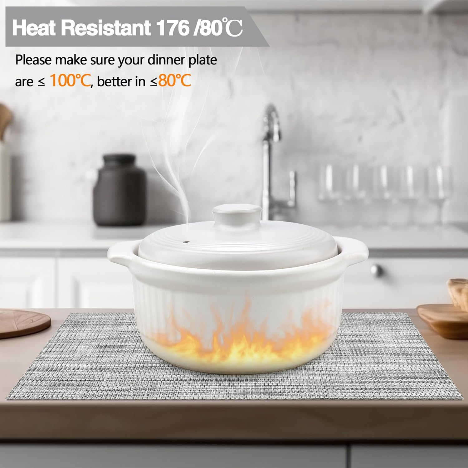 - Heat Resistant: Please make sure your dinner plate are ≤ 100℃, better in ≤80℃. It can prevent the table from slipping and scalding the countertop. These beautiful stylish vinyl place mats to add more fun to your dining table