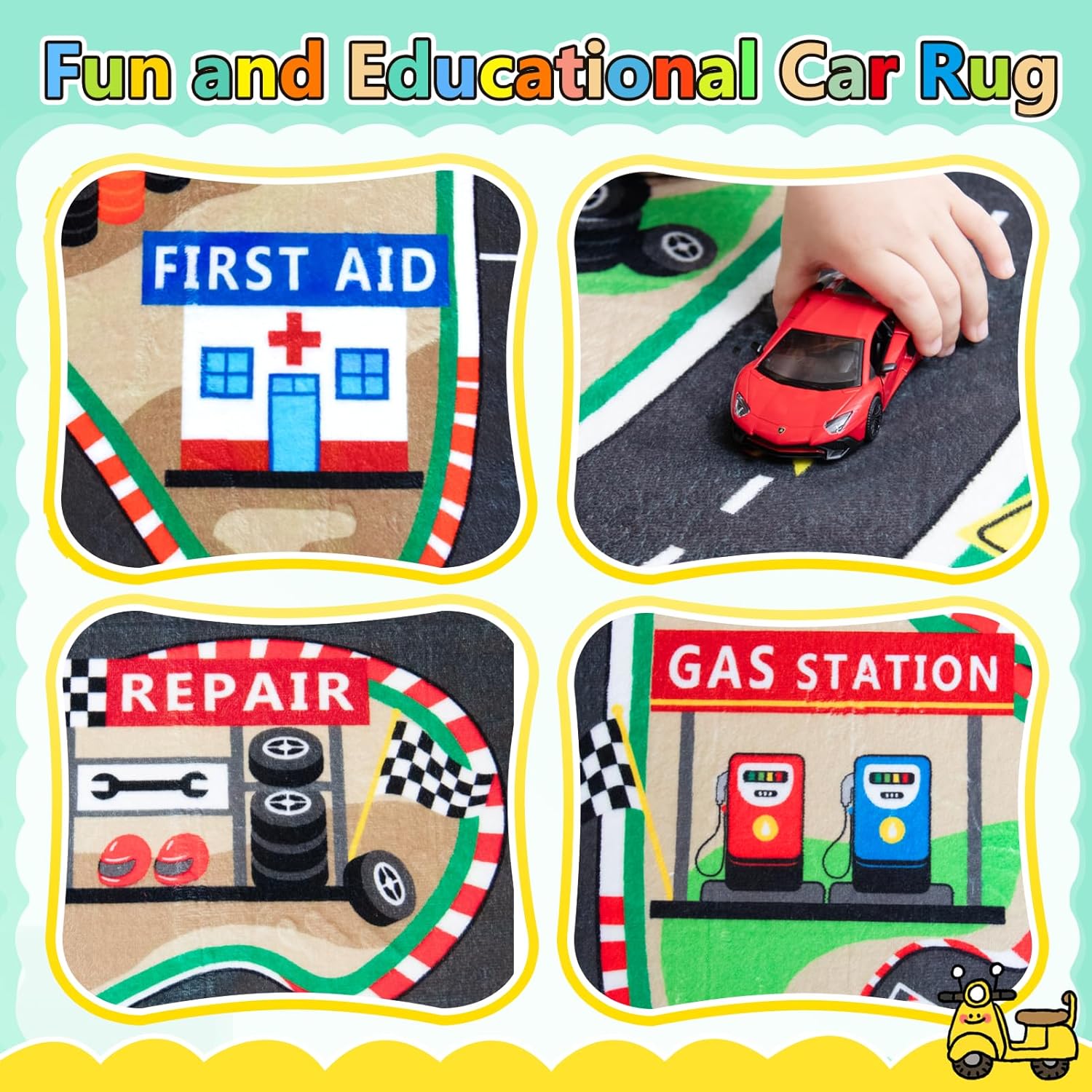 - [Unique Design]: This race track rug features a realistic 3D cascading surround route, complete with a start, and Finish line markings. The car rug is perfect for kids who enjoy playing with race cars. The vibrant colors enhance indoor play, creating an exciting outdoor experience at home