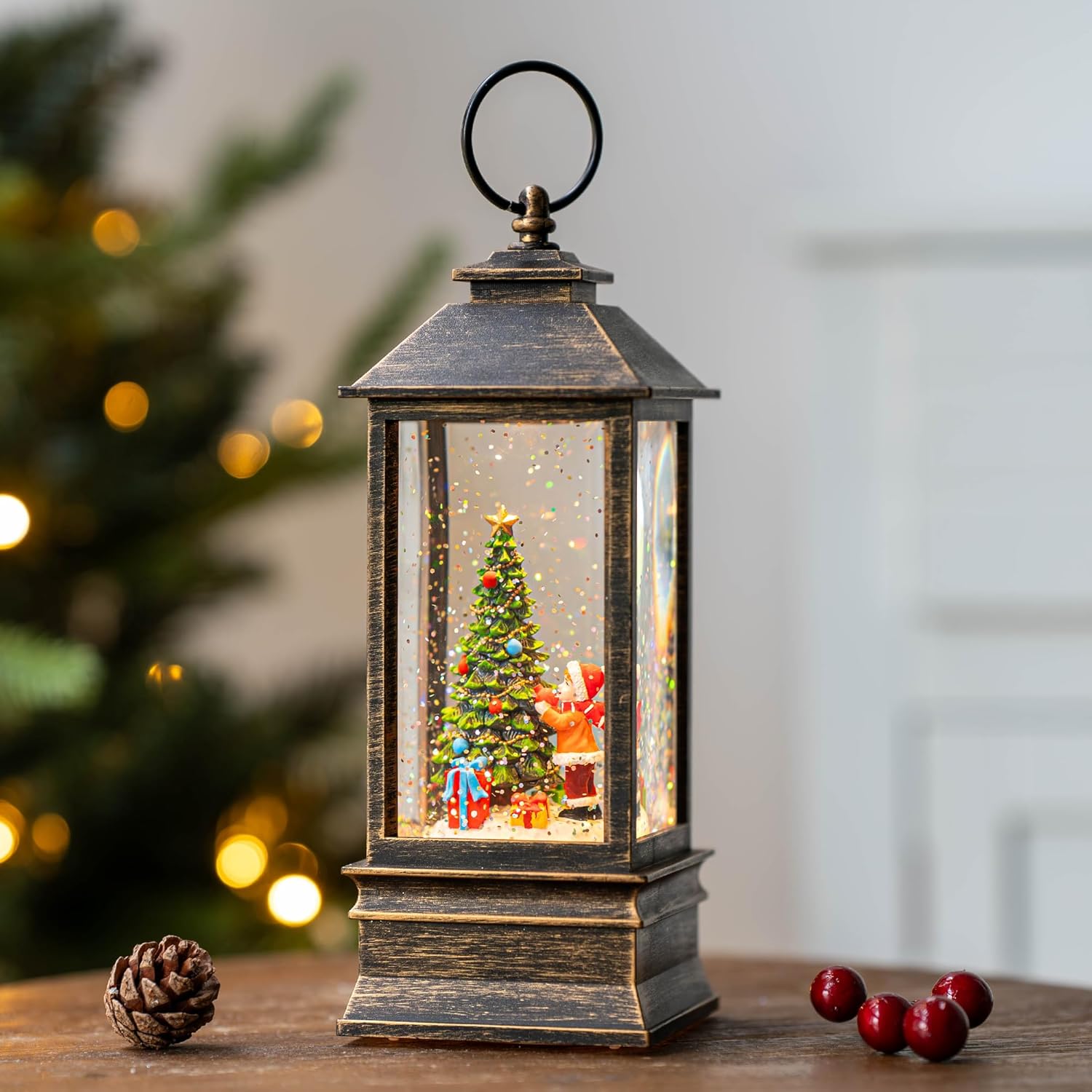 - 【Snow Globe Lantern】Lighted the child is decorating the Christmas tree, When turned on a warm LED shines on the figurine and swirling glitter to gives our Christmas globe a whimsical look for the Christmas Holiday season.