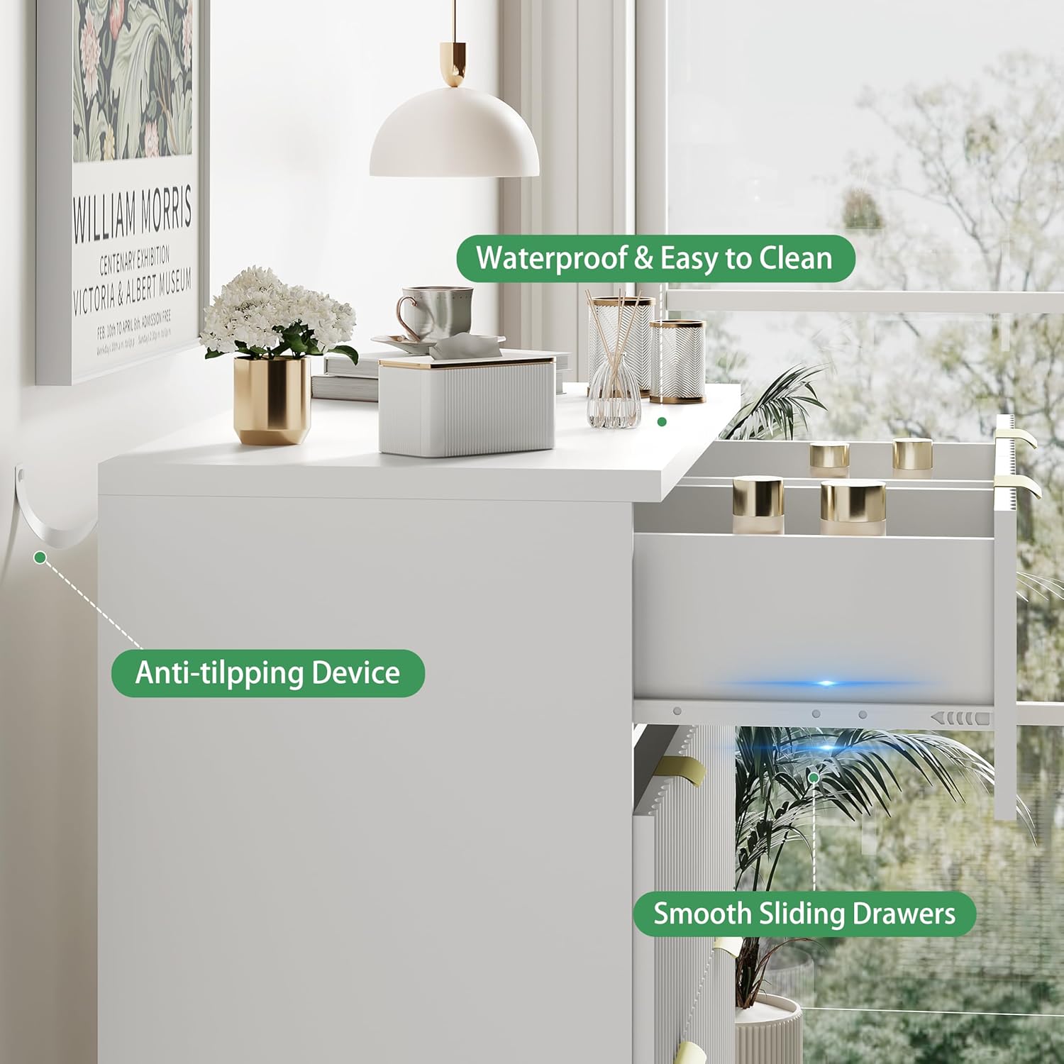 - 【Stability & Safety】The white/black/natural oak/grey dresser is equipped with an anti-tipping device, which can be fixed on the wall to prevent accidents. Each drawer contains a wide metal handle and built-in slide rail, easy to push and pull. Besides, the sturdy base provides this dresser with drawers a strong support and the middle feet can be adjustable to keep balance on uneven floors