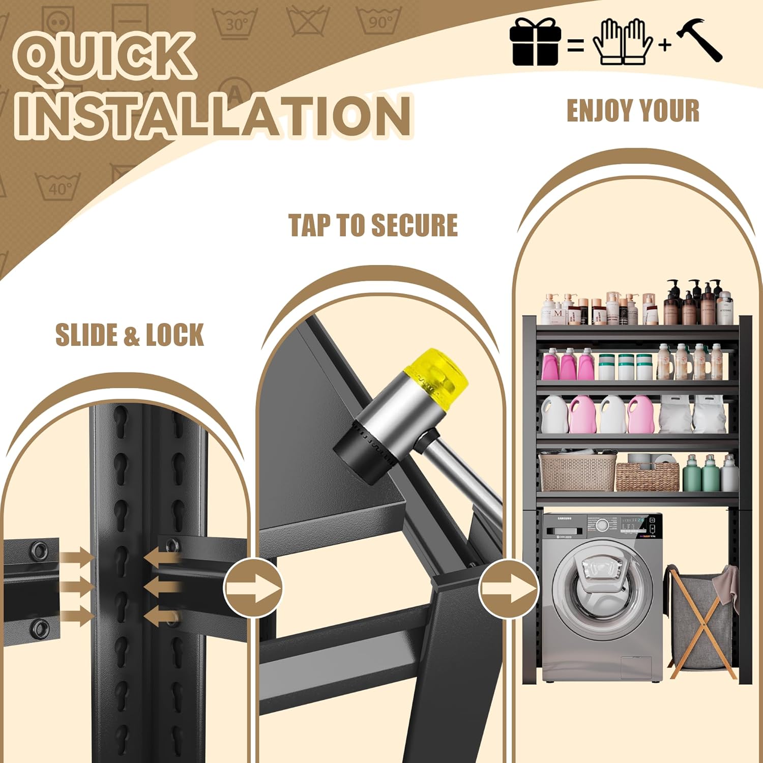 - β FRUSTRATION-FREE, NO-BOLT ASSEMBLY Get organized in minutes, not hours! This washer dryer shelf features an innovative rivet-lock design that snaps together easily, often without any nuts or bolts. We even include a rubber mallet to make setup a breeze. You'll have this sturdy, free-standing structure assembled and ready to declutter your space long before the next laundry cycle finishes. It's the most user-friendly laundry room shelving units you'll ever own.