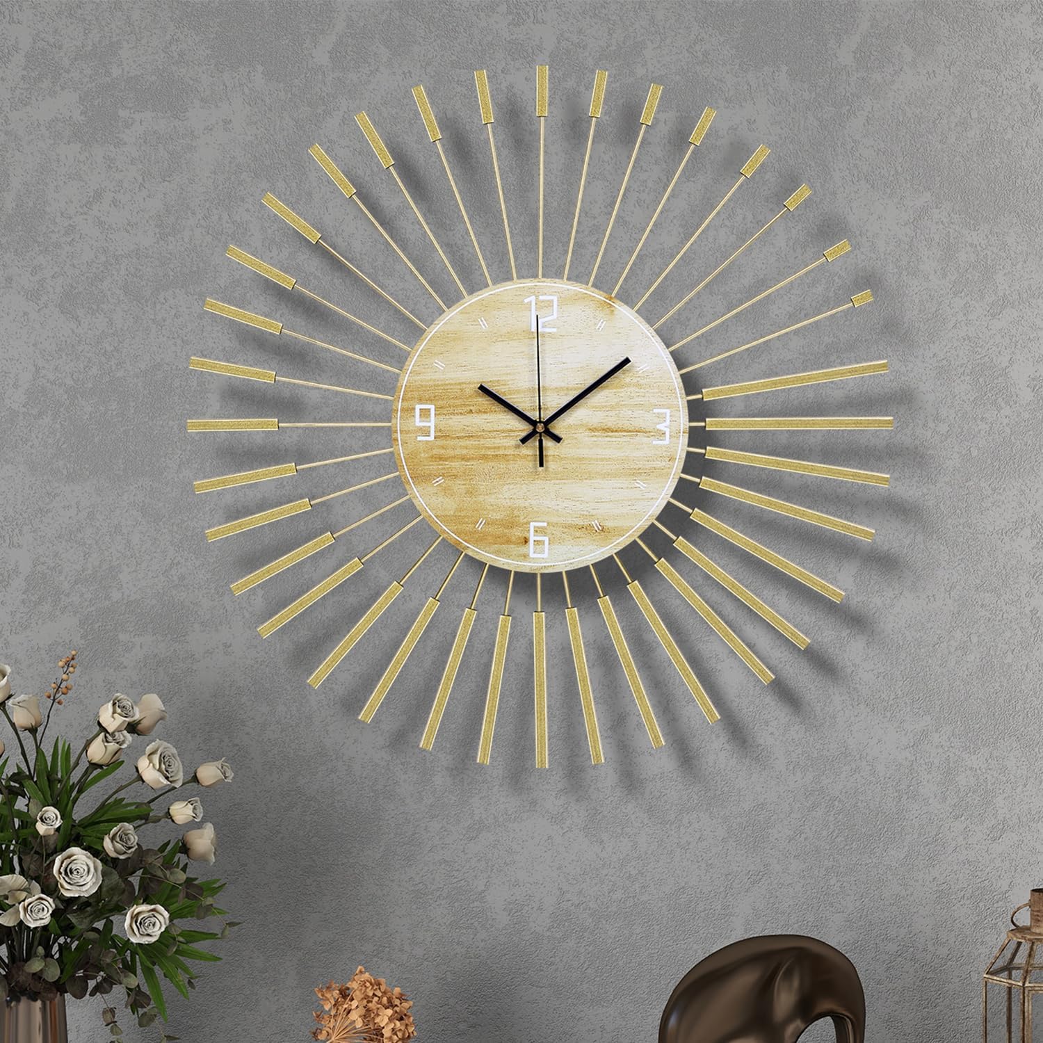 - Iron and Wood Combination Wall Clock β Designed with sturdy iron rays in a radiant sunburst , paired with a warm wood face for a stylish yet natural look.