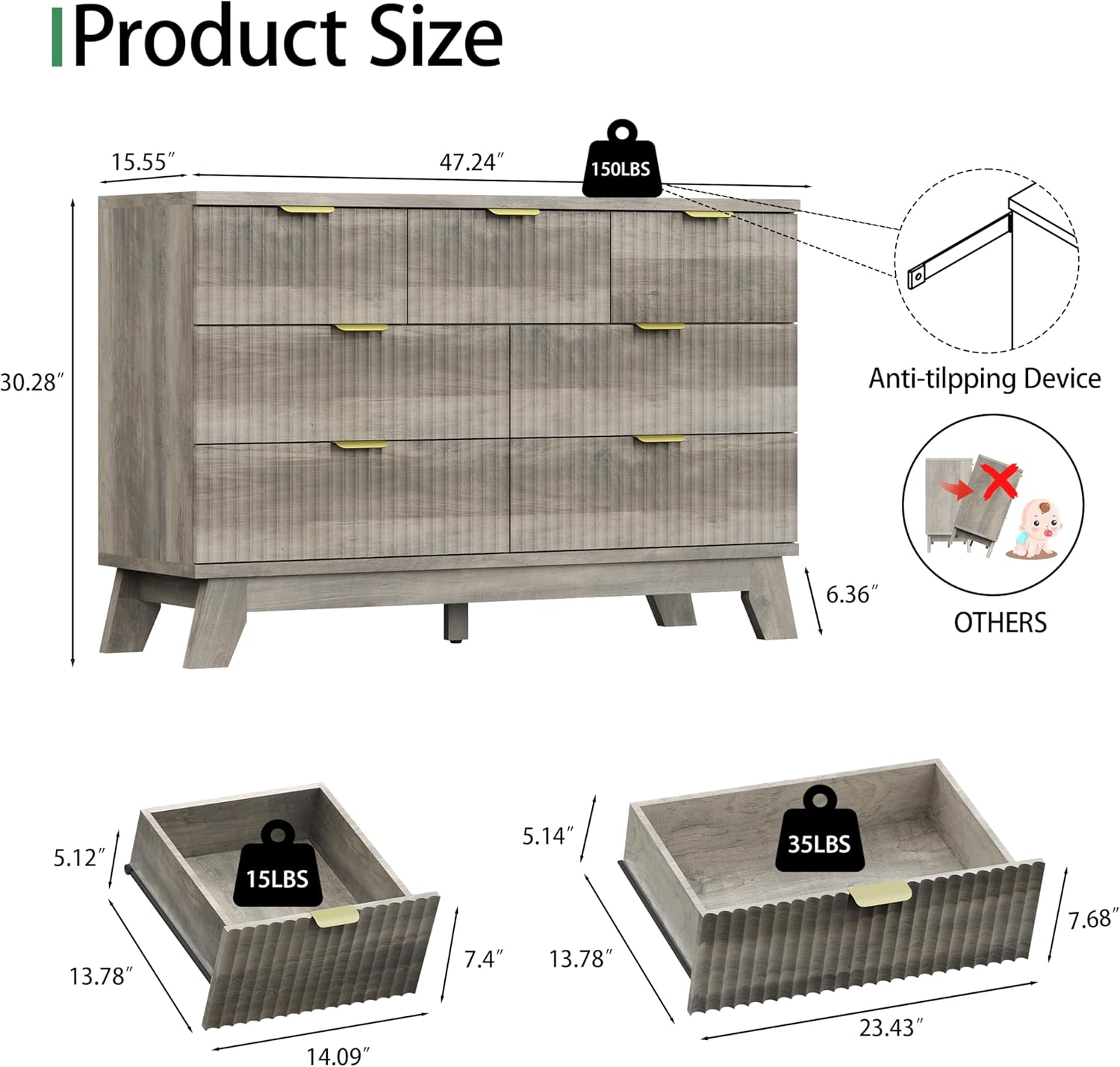 Fluted Dresser for Bedroom with 7 Drawers, 48" Wide Modern Chest of Drawers with Metal Handle, Wood Dresser TV Stand, Wooden Closet Clothes Storage Organizer for Living Room, Hallway, Grey