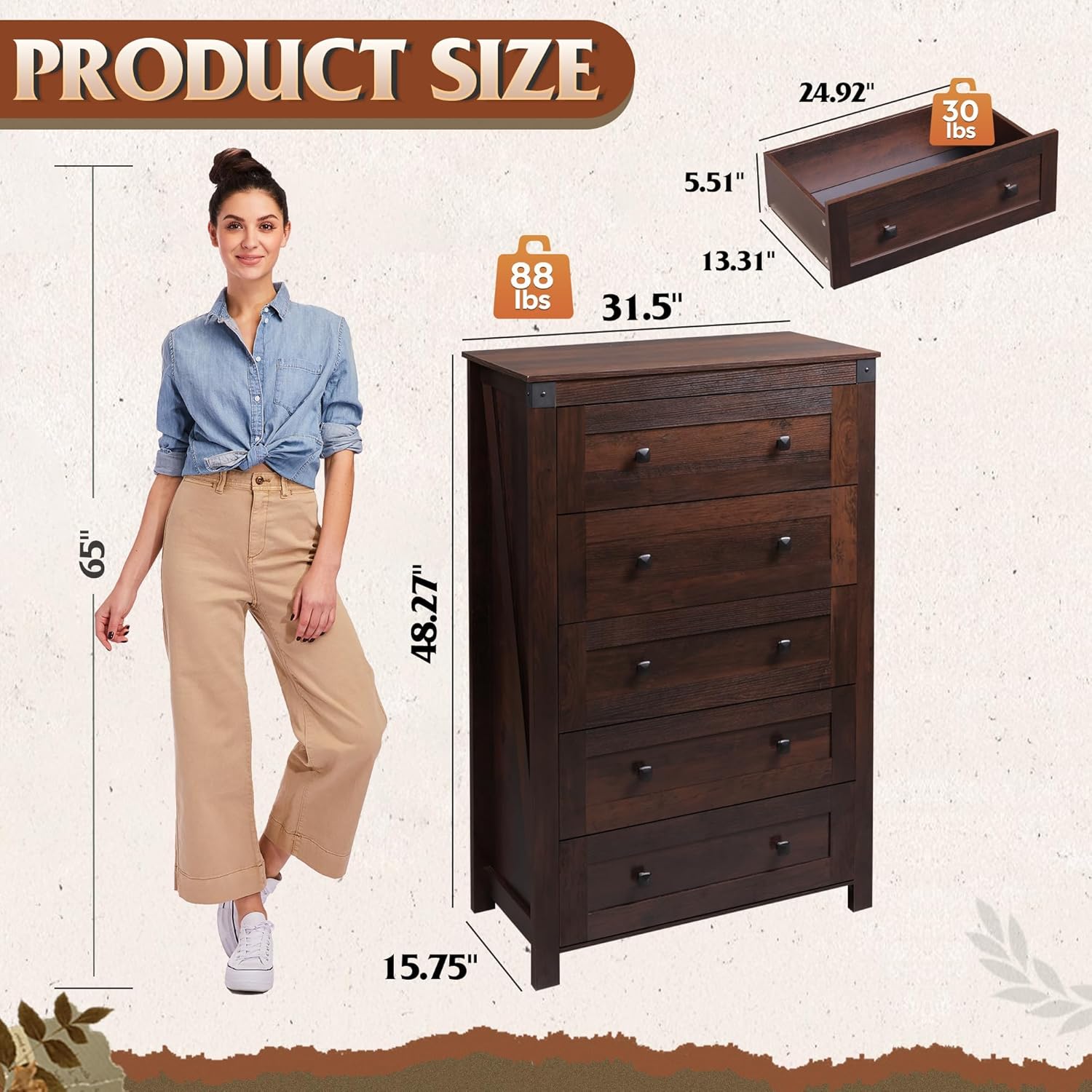 - 🎄【Farmhouse 5 Drawers Dresser】This wooden dresser farmhouse look is heightened by the rustic color finish coupled with the side barn sign and the dark square handle adds a rustic charm. It can be used for bedroom clothing organizer, entryway table, decorative storage for living room.