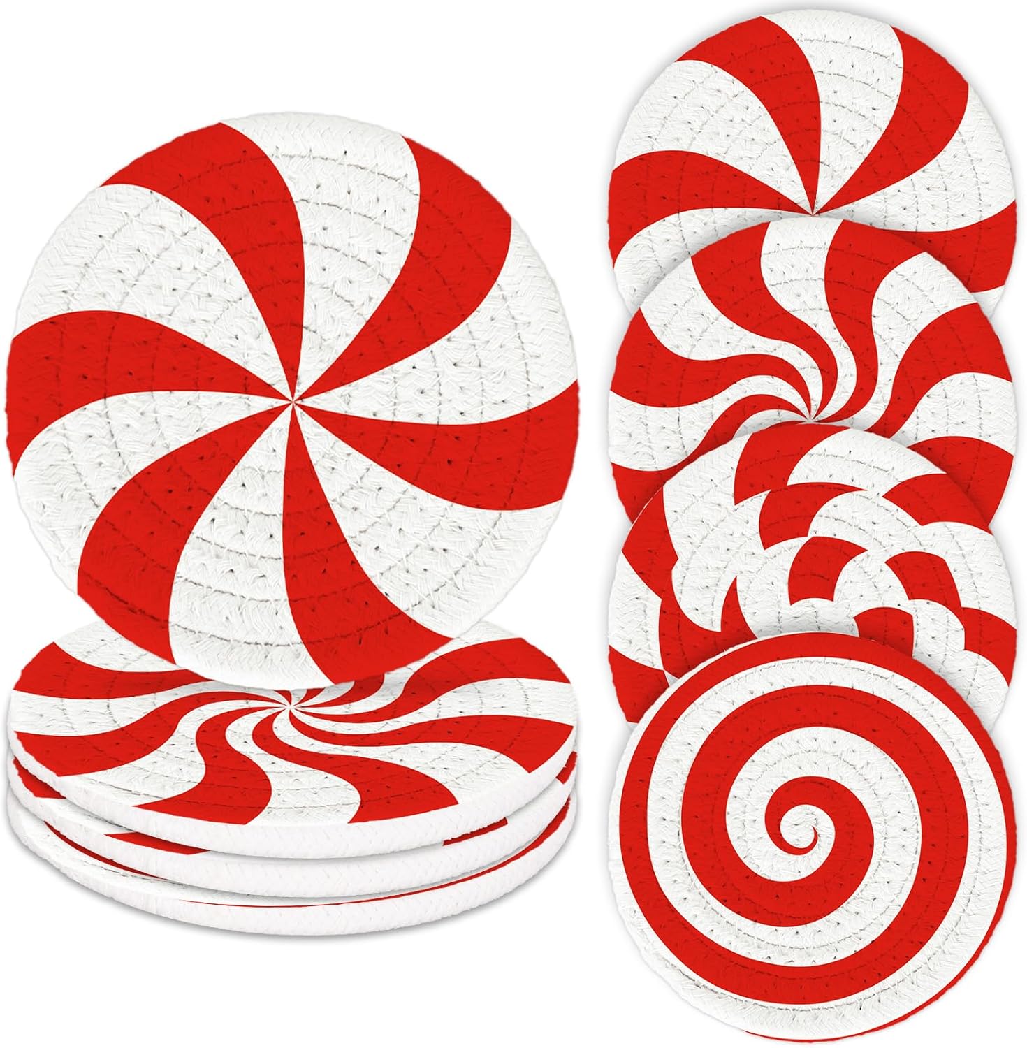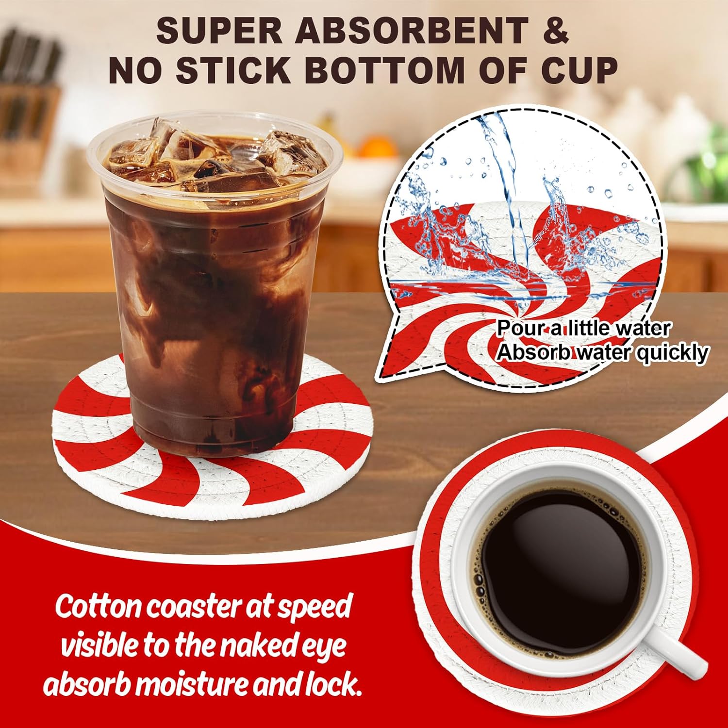 Whaline Christmas Candy Cotton Coasters Red White Peppermint Handmade Braided Drink Coasters Absorbent Cup Mats for Xmas Holiday Party Home Table Decor, Set of 4